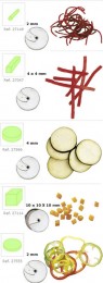 - соломка 4х4 мм и комплект для нарезки кубиками: ломтики 10 мм в совокупности с ножом-решеткой 10х10 мм (морковь, вареный картофель)